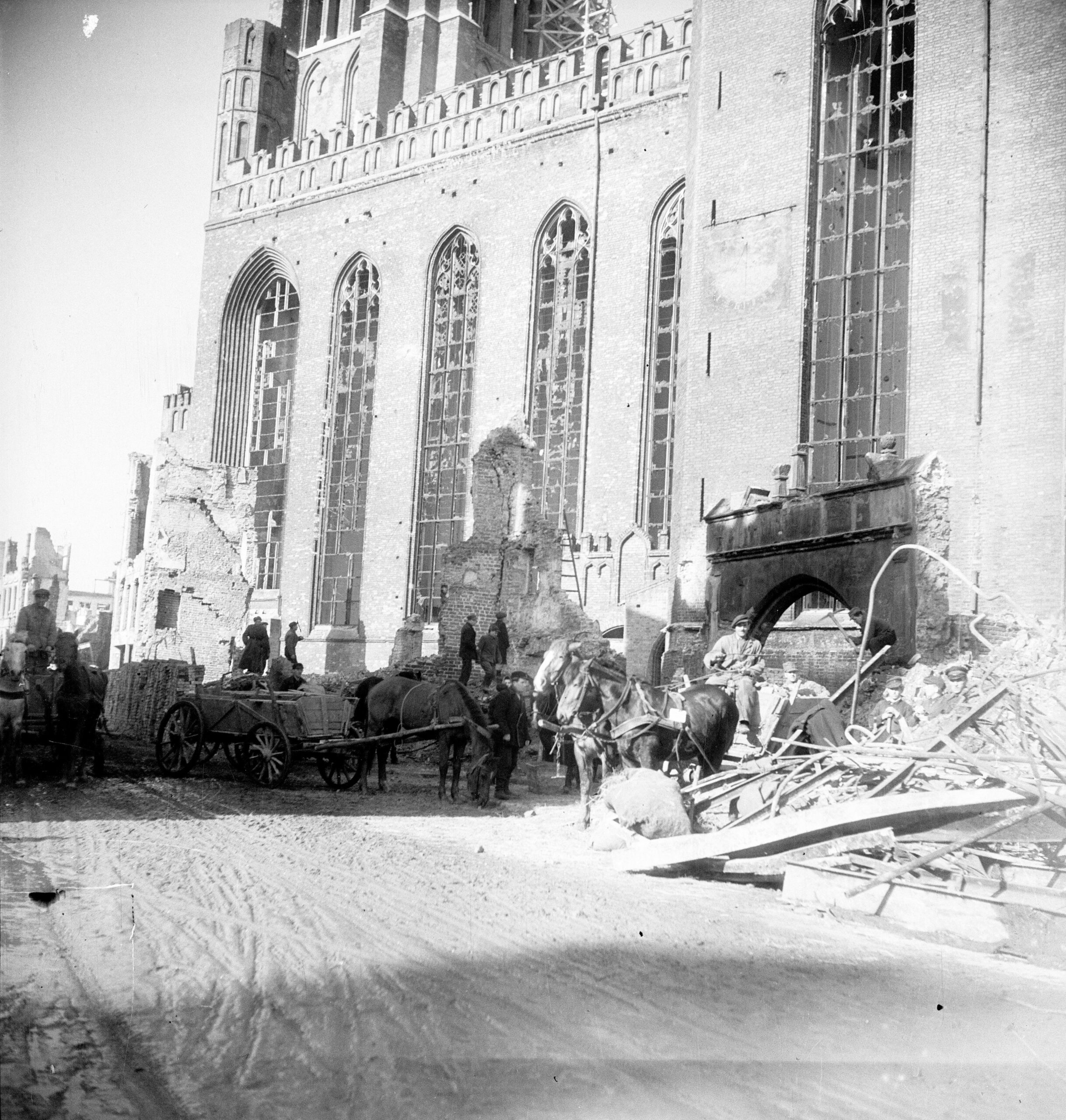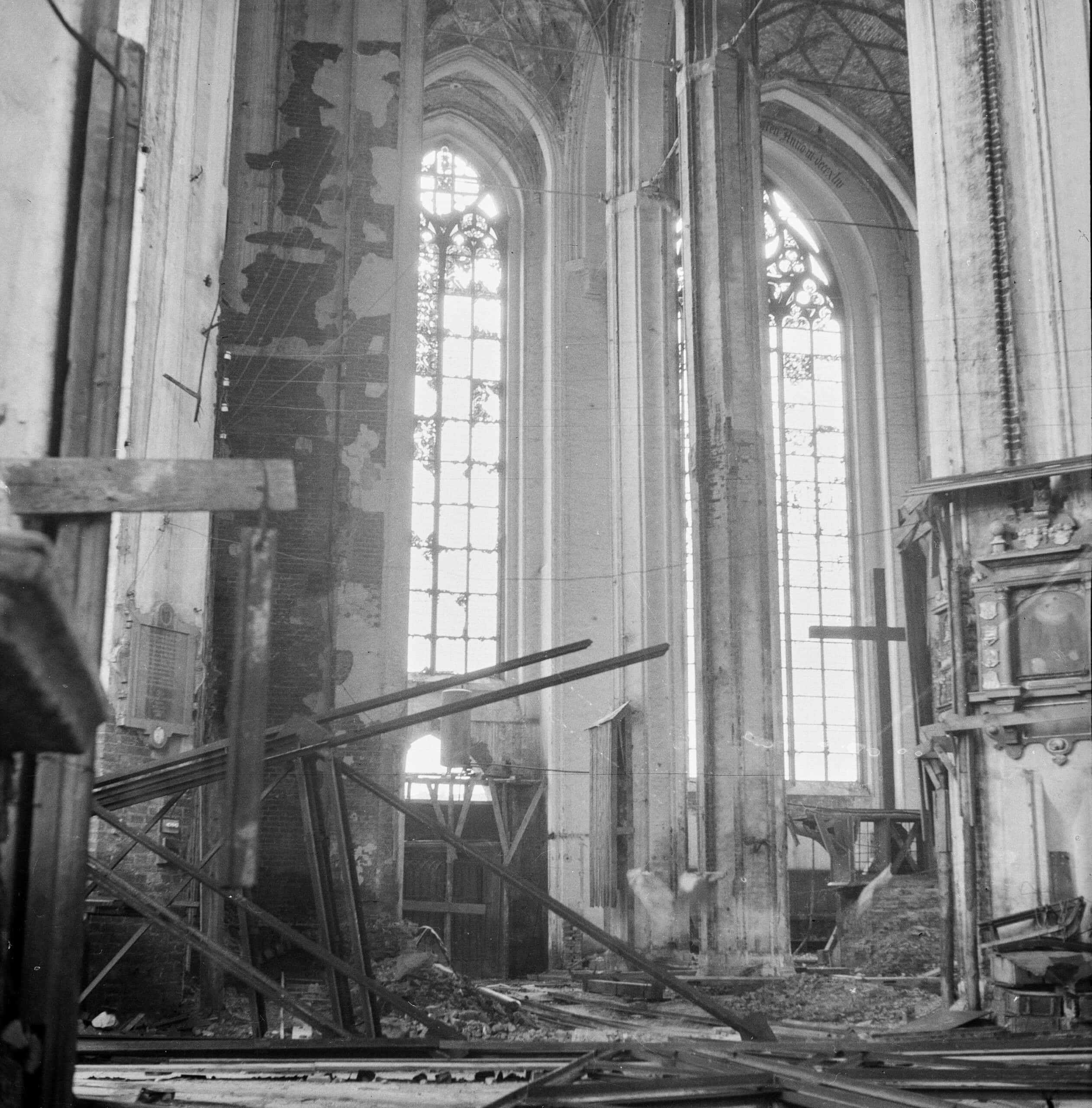 1945 W wyniku działań wojennych kościół uległ bardzo poważnemu zniszczeniu. Dach głównej wieży został zerwany, wieża uszkodzona i wewnątrz wypalona. Sześć dużych dzwonów spadło i rozbiło się, siedem bocznych wieżyczek oraz dwie sygnaturki zostały spalone. Dach nad całością świątyni zapadł się całkowicie i zburzył swym ciężarem część sklepień. Witraże okienne i bramy zostały zniszczone całkowicie. Wewnętrzne bogate urządzenia uległy poważnej dewastacji.